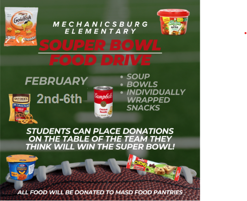 Starting on Monday, February 2, students are asked to bring in one of the items below and vote for who they think is going to win this year's Super Bowl . All the items will be donated to the district's food pantry which supports families within the Mechanicsburg Area School District. |