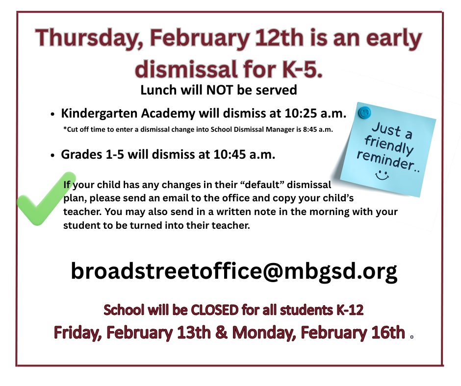 Continue to ask your children what they learned in school, how they were a positive leader, and challenge them to think of ways to served the Broad Street learning community. These discussions facilitate creativity, assist to summarize learning, and establish a priority for education. Our collective efforts are what makes Broad Street a special place to be. I appreciate your support and efforts as the home and school connection is essential. I also wanted to make you aware that Mrs. Bradley will be out of the office for the month of February due to a scheduled surgery. During that time, Mrs. McCorkel and Mrs. Moreno will be covering in the office. A reminder to everyone that a photo ID is required when picking up a student. Since our substitutes may not recognize all families right away, having your ID ready will help make the pickup process smooth and keep our students safe. When calling or emailing the office, please be sure to include your child’s first and last name, as well as their teacher’s name. This will help us assist you more quickly. Thank you so much for your understanding and patience. Mrs. Bradley is looking forward to seeing everyone again in March! Thank you again for your support of our learning community.